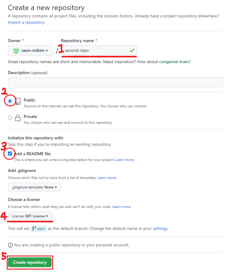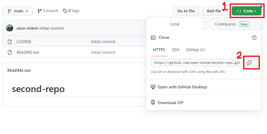 1번을 누르고 2번을 클릭하면 방금 생성한 나의 레포 주소가 복사